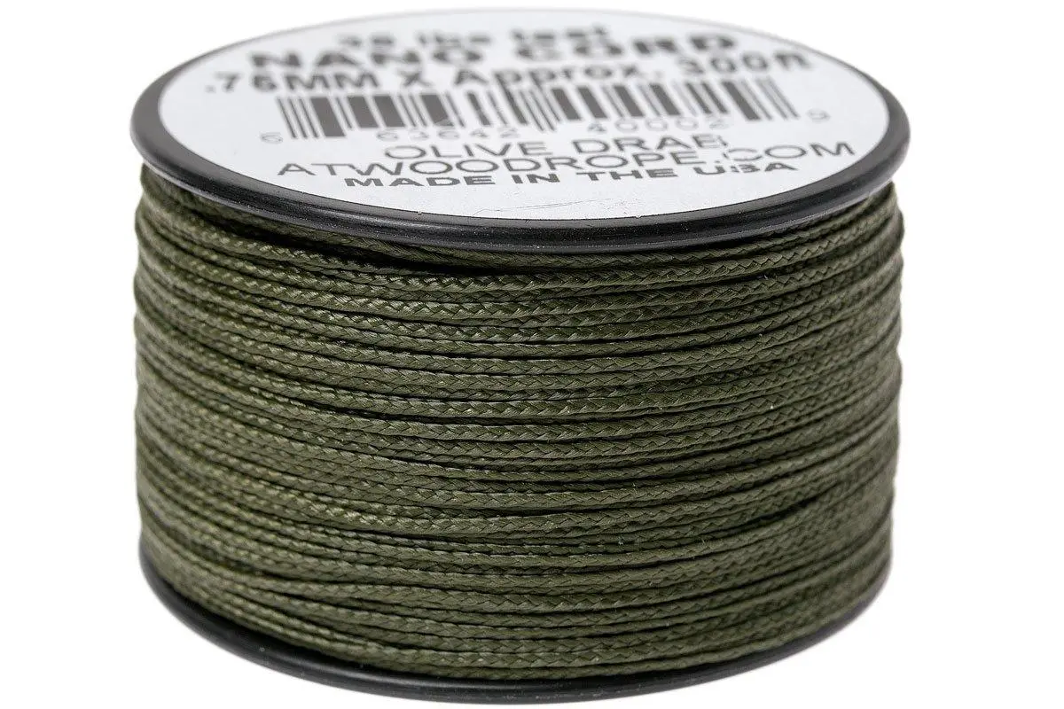 Atwood Rope MFG Nano Cord is a great tool for various purposes. Nano Cord is comparable to Paracord and Micro Cord, but only slightly thinner. Nano Cord is comprised of one single strand without core. As such the rope is only 0.75 mm thick. This nano cord is added to a choil and has a total length of 300 ft (91.44 meters).