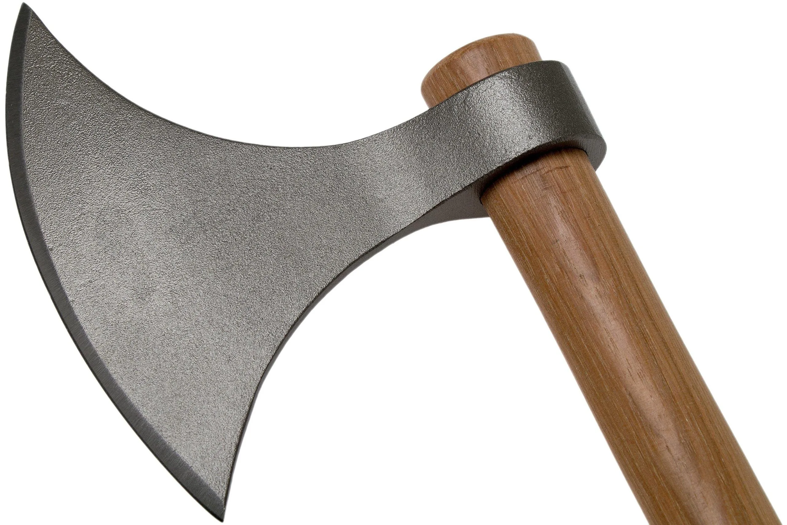 The Cold Steel Viking Battle Axe – 90WVBB has a long 59 cm handle. As such this axe is not just any lumberjack tool, but rather a thin, fully polished and hand-sharpened, powerful knife. The sharpened part starts and ends with a sharp point. The top part is slightly longer than the bottom part. Practical if you want to take hold of something.