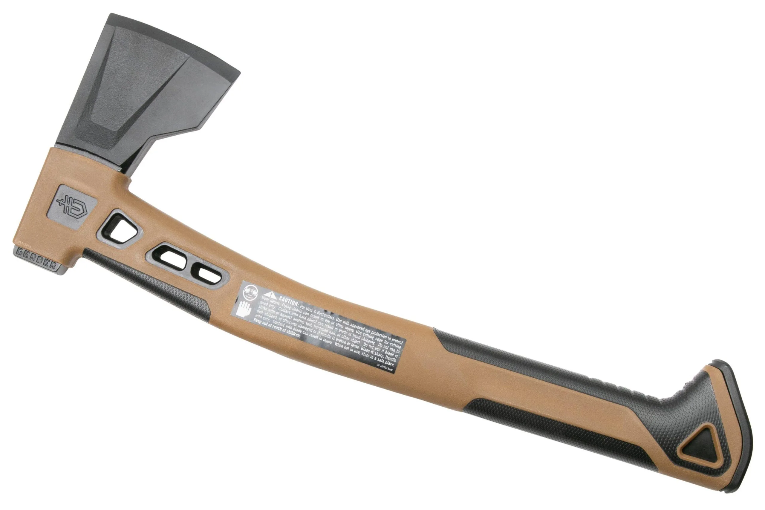 This Gerber Bushcraft hand axe is a compact axe for bushcraft and camping trips. The ergonomic design ensures good grip, even in wet conditions. The cutouts in the handle reduce weight and improve grip for smaller tasks when you are holding the axe close to the head. The axe comes with a nylon sheath.