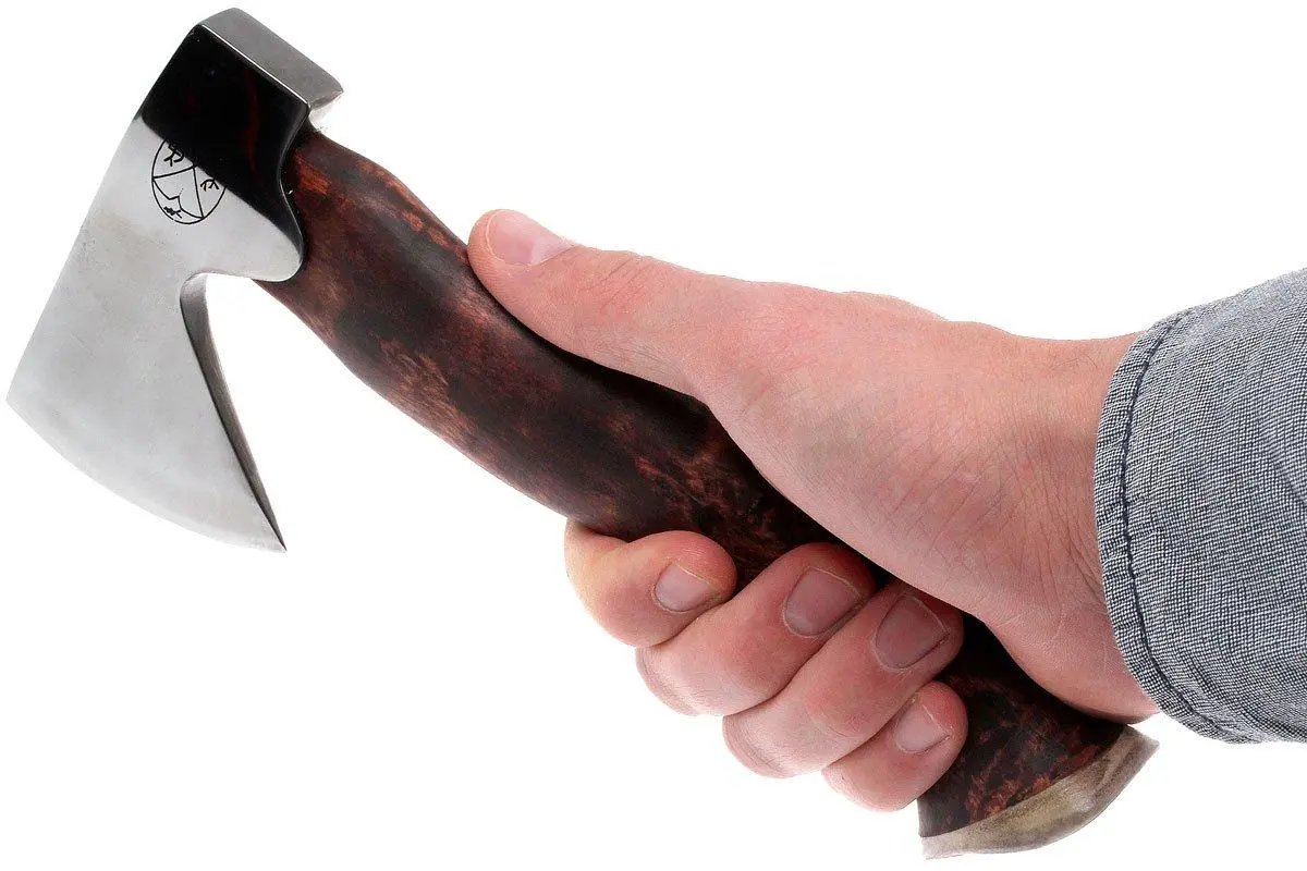 The Karesuando Unna Áksu (hunting axe) is a very beautiful little axe, perfect as a gift. The curly birch-wood handle has a beautiful drawing and is shaped to give comfortable grip. The end of the handle has a piece of reindeer antler and finished the axe gorgeously. Also they have laid-in a piece of reindeer antler into the handle which features the Karesuando logo. The axe head is made of polished stainless steel and has some drawings of the Sami people, from the area around Karesuando (Sweden).