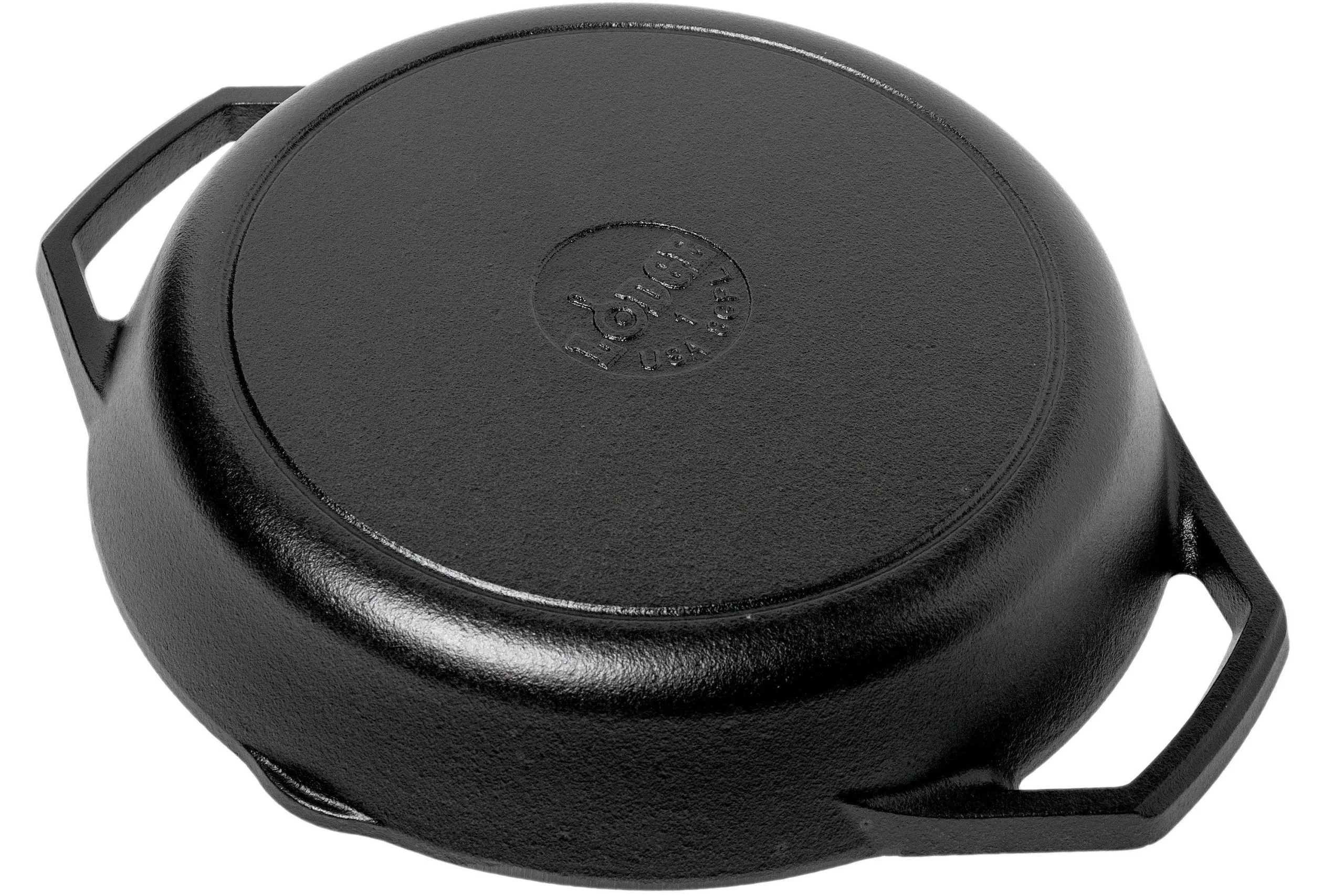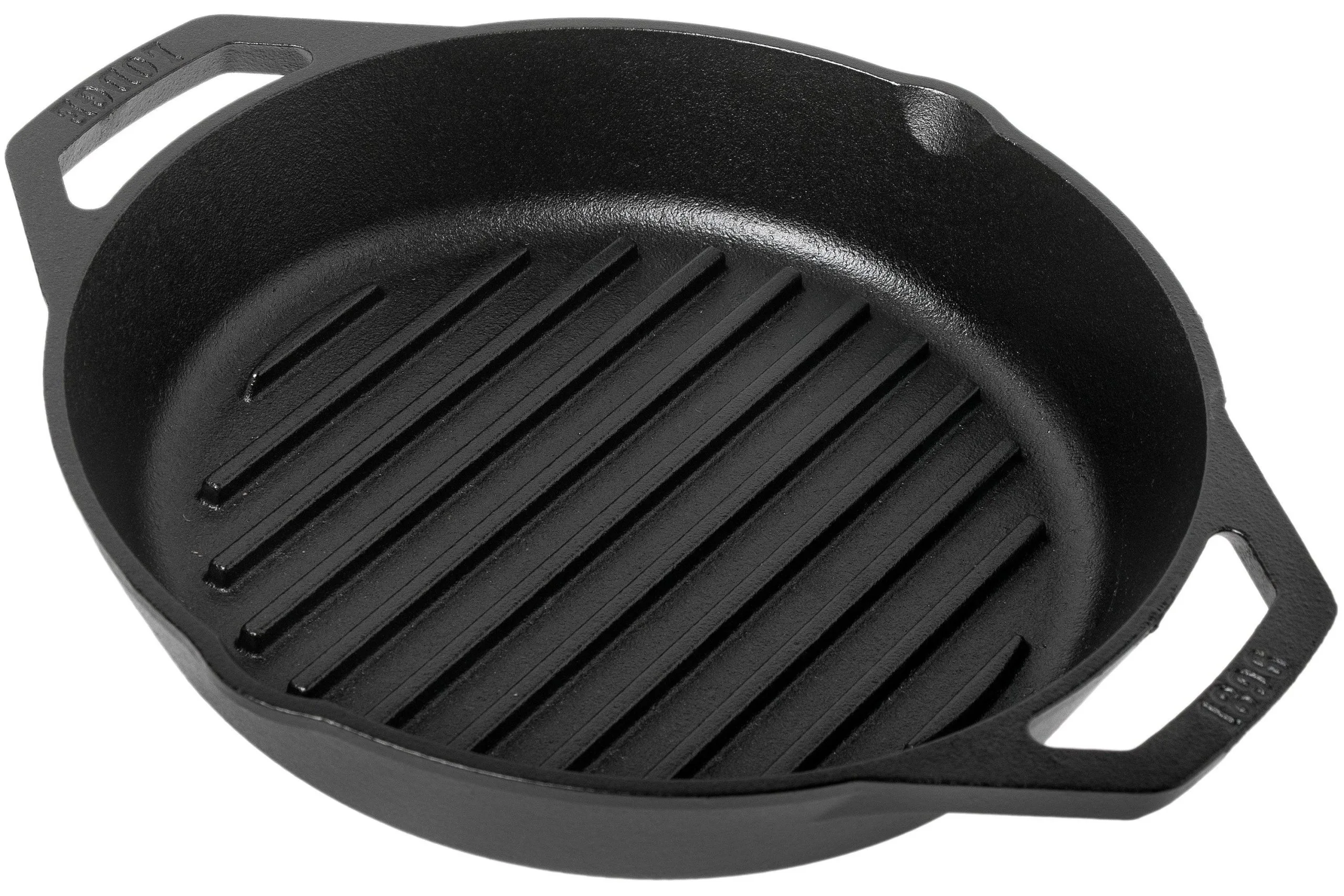 The Lodge frying pan/grill pan with two handles is a cast-iron pan that will help you prepare the most perfectly grilled pieces of meat or vegetables. The cast-iron retains the heat well and perfectly distributes it. No strange spots in the pan where your food won’t heat up! The deeply ridged surface ensures that any fat is drained. The same ridges also leave stunning grill stripes on your meat or vegetables. This grill pan can be used on any cooking hob. Put it in the oven, or your stove, or hang it over an open flame. It even works on induction. The two flat handles ensures that the pan won’t take up too much room on the stove.