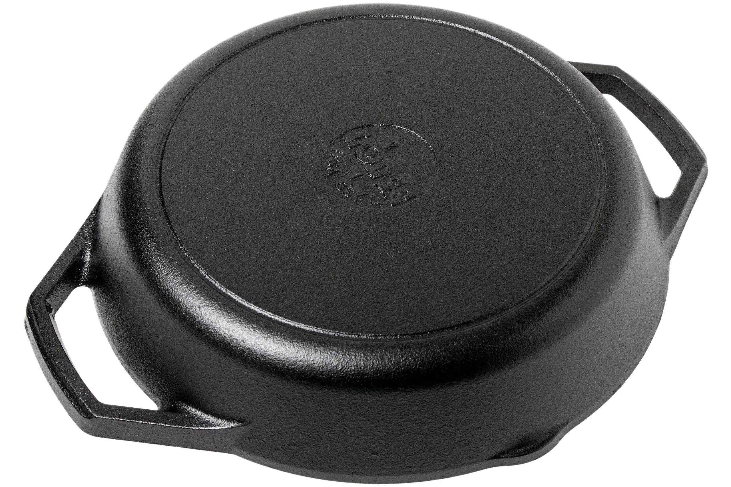 This Lodge skillet grill with two handles is a cast iron frying pan, perfect when baking, roasting, stewing or grilling. The cast-iron retains the heat well and perfectly distributes it. No strange spots in the pan where your food won’t heat up! And the frying pan can be used on all cooking hobs. Put it in the oven, or your stove, or hang it over an open flame. It even works on induction. The two flat handles ensures that the pan won’t take up too much room on the stove.
