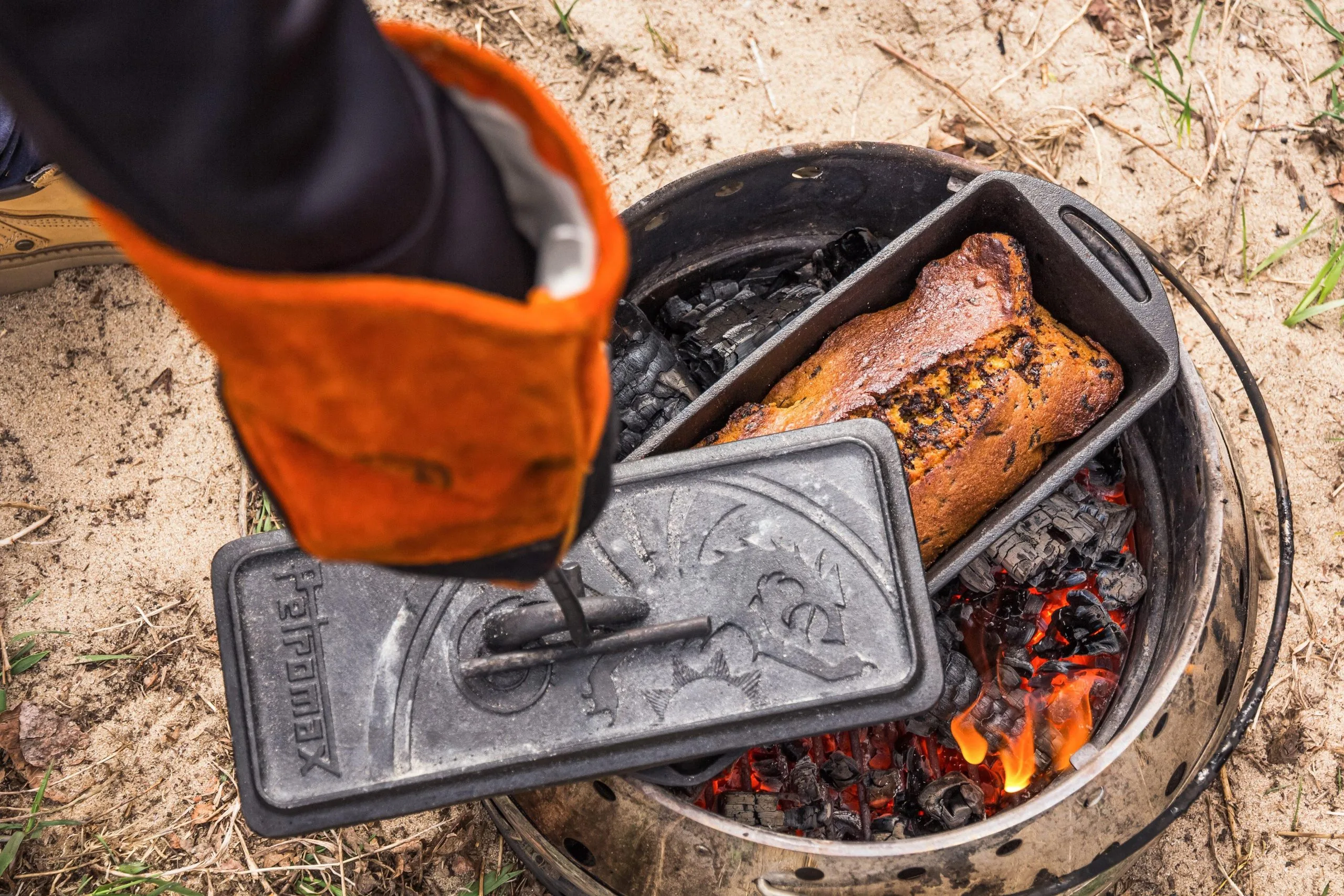 If you are familiar with the excellent qualities of cast-iron you will know that this Petromax bread tin should be a part of any (outdoor)kitchen. In this Petromax baking tin you can bake delicious cakes, freshly baked bread, stews or roasted meat. The bread tin is made from cast-iron. Thanks to the excellent qualities of cast-iron the heat is gradually and very evenly distributed and retained. Whether you use the pan over an open flame or if you place briquettes on top of the lid to use the pan as an oven. Because of the flat base the pan will work on all types of cooking hobs, including induction.