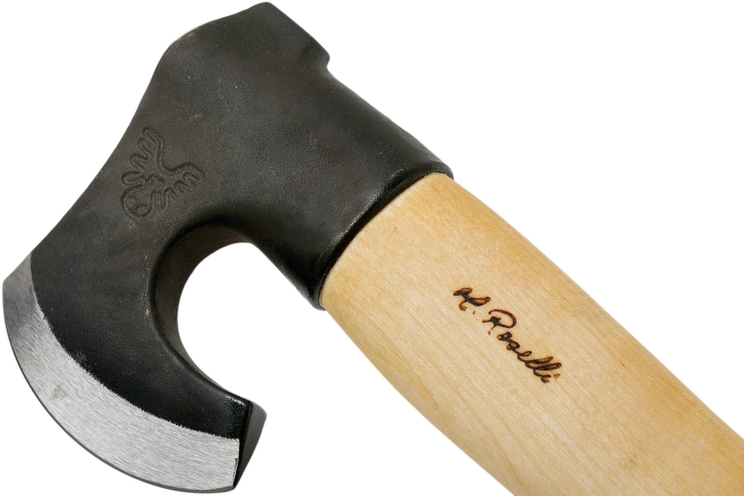 The sleek Roselli Axe hand axe is an effective axe to cut kindling or for the finer woodworking tasks. The large axe head and the curve of the blade ensure that the blade does not get caught in the wood. Because of the shape of the head you can place your hand close to the blade, making the more detailed tasks a piece of cake. With the straight edge and the thicker knob this axe feels great in hand. All Roselli axes are made by hand in Harmoinen, Finland. Stunning old-fashioned craftsmanship with a sleek, modern design.