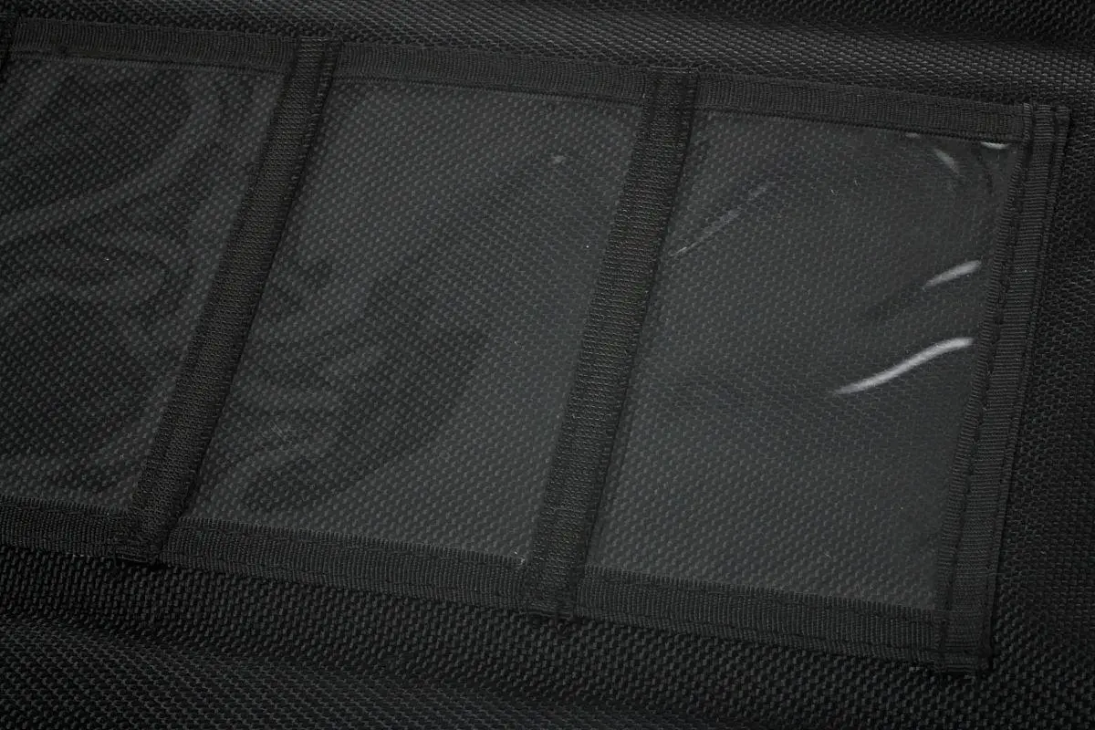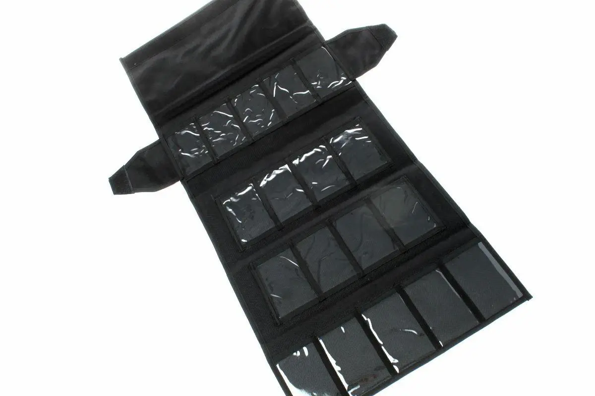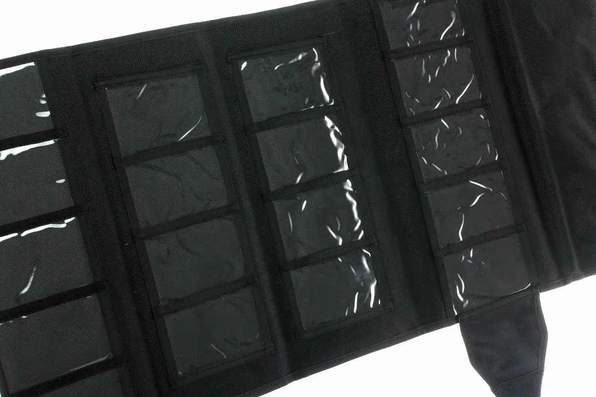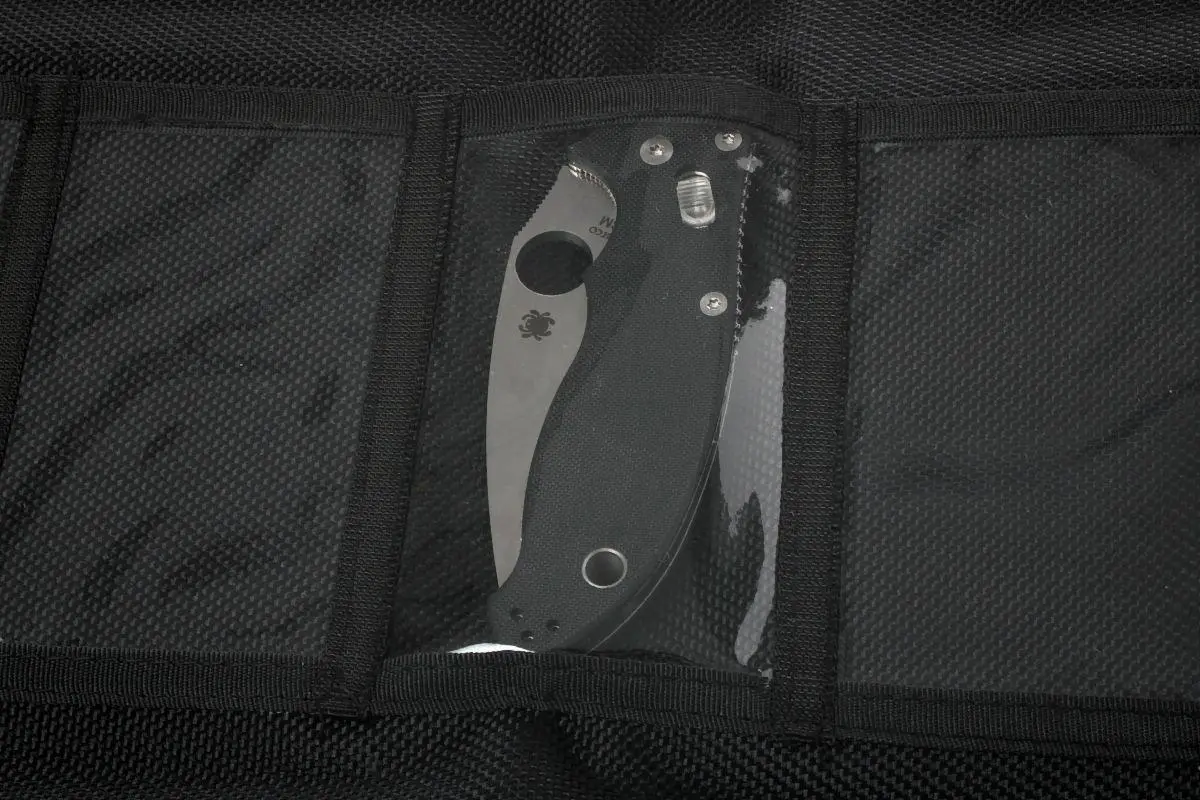 Constructed from heavy-duty Cordura polyester (note its weight!), this case features 18 deep pockets sized to hold larger pocket knives quite comfortably. Each knife is separately stored in its own pocket with transparent plastic window. These separate pockets ensure that knives cannot get damaged by rubbing or scratching against each other. A Velcro strip is used to seal the case and it comes with a handy carrying strap. Dimensions of pockets: 6.5 x 11 cm.