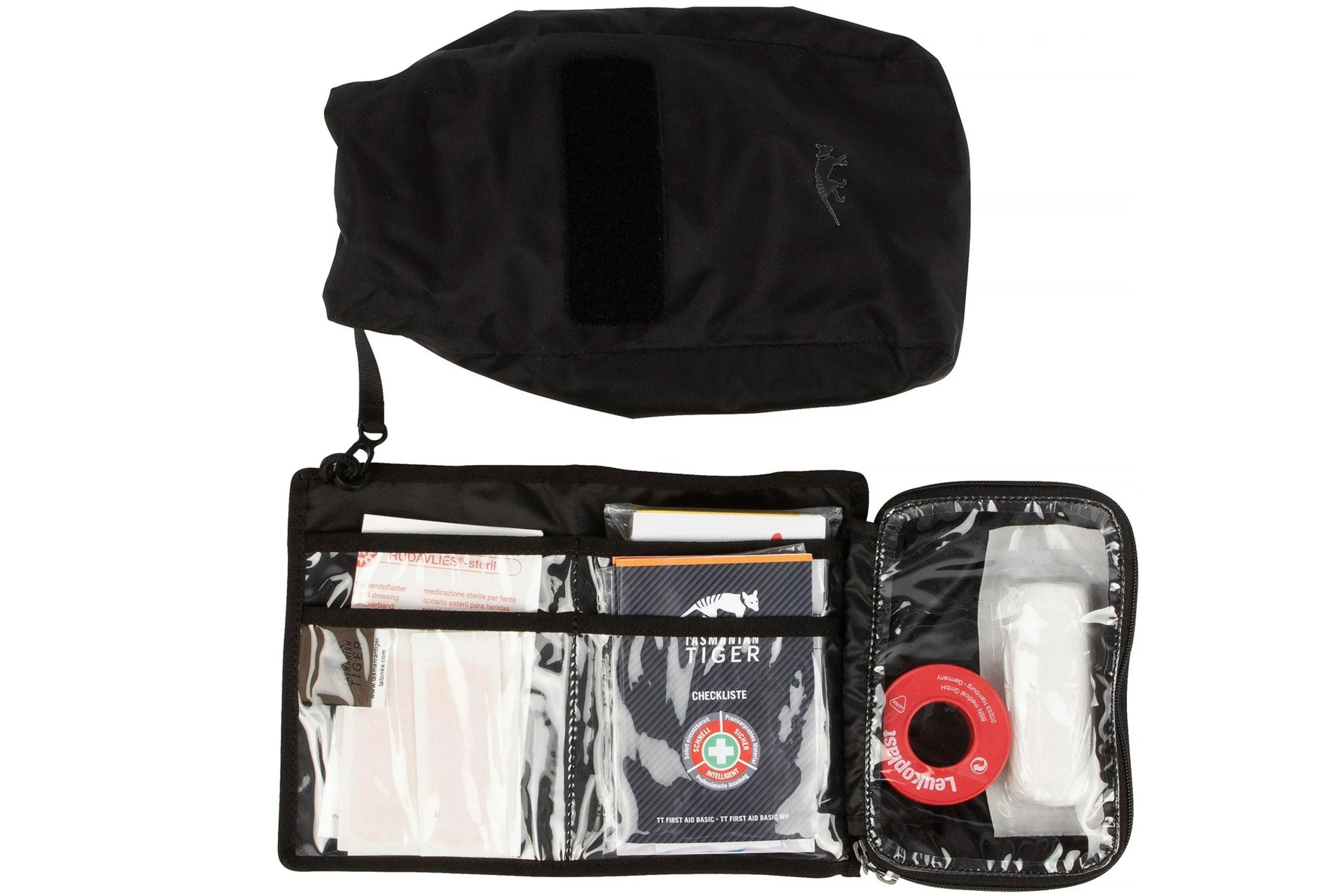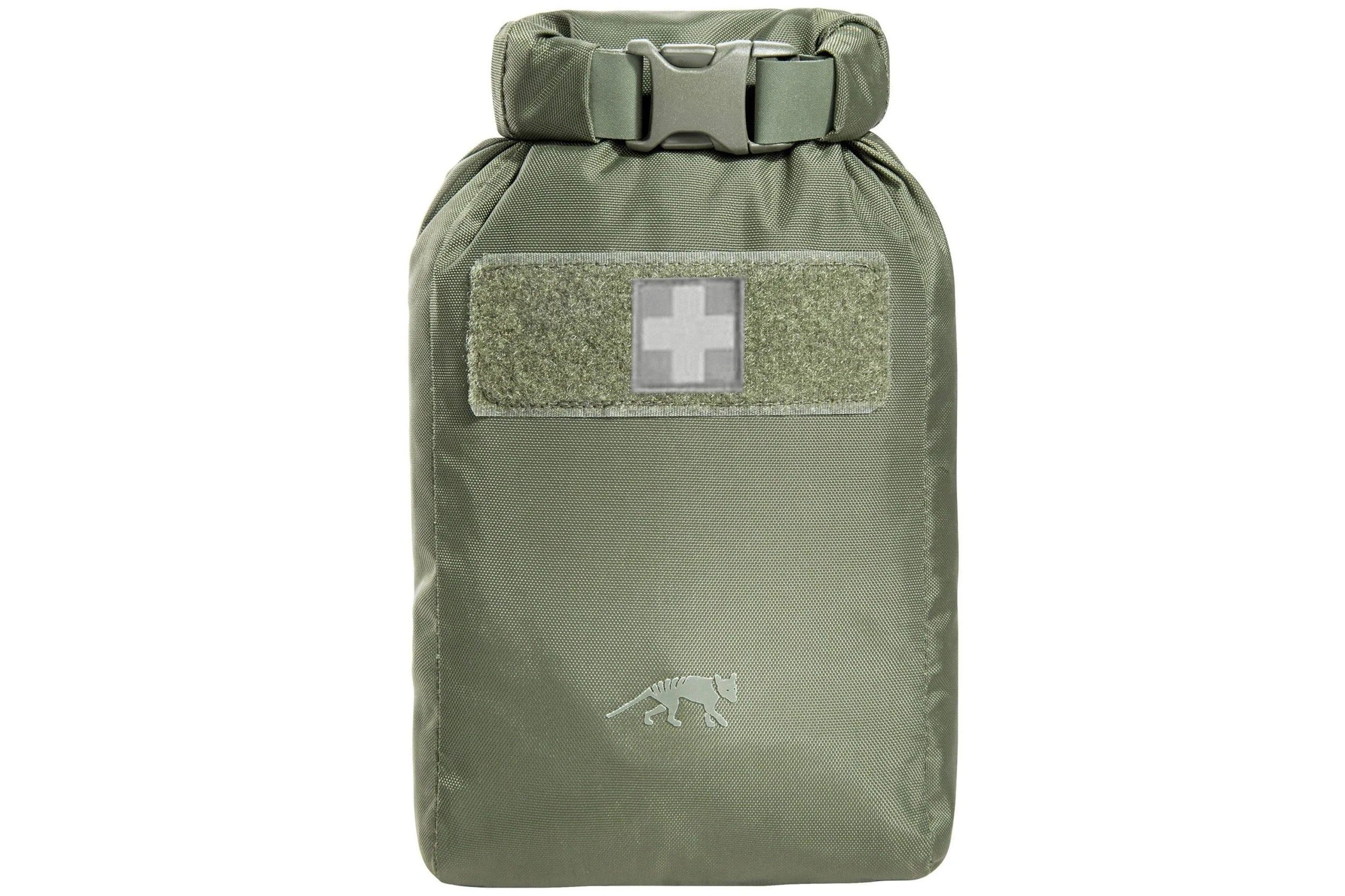 The Tasmanian Tiger first Aid Basic Waterproof kit is a waterproof survival kit with a couple basic first aid tools you need when you go out. The pouch is made from the waterproof T-Cover Tex and has taped seams. You close it by rolling up the top. Make sure you roll this top at least 4 times to make sure the pouch is waterproof.