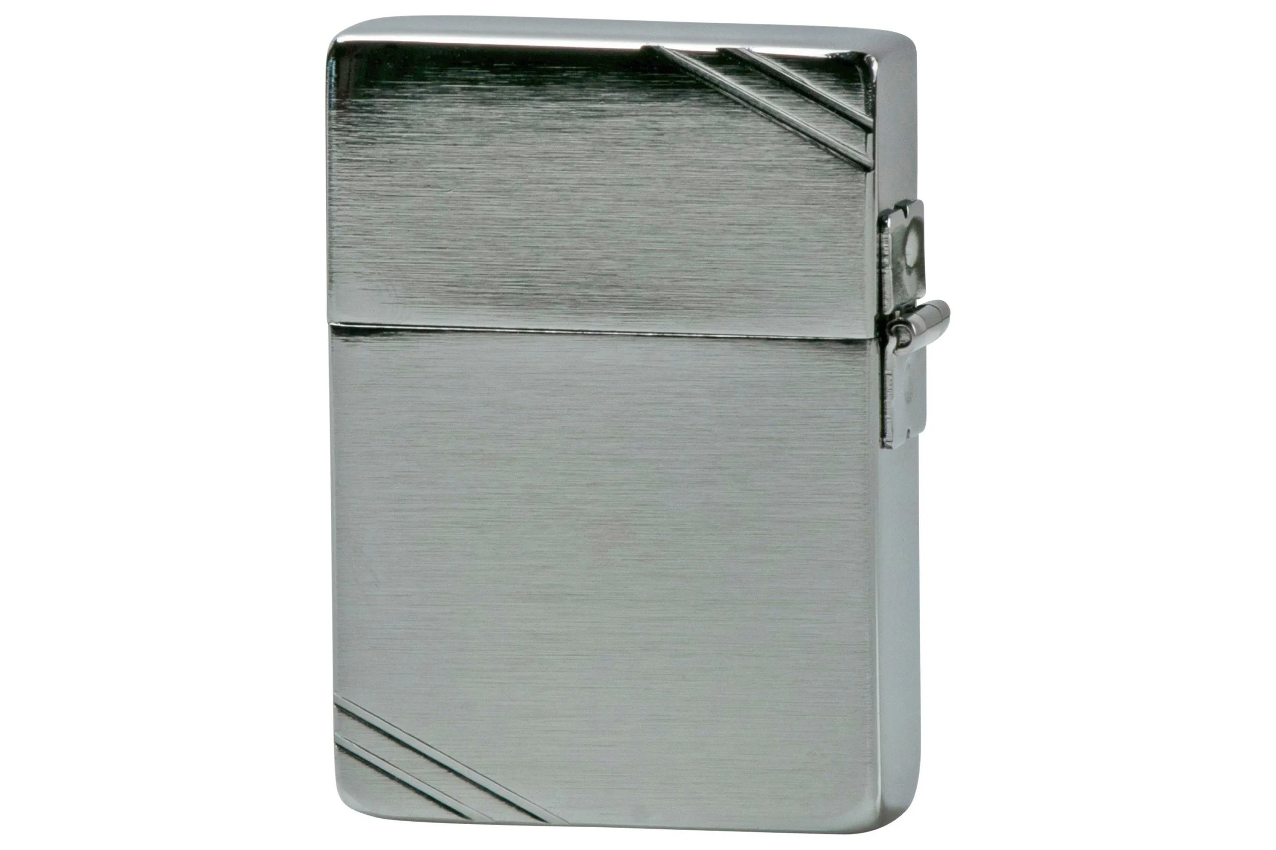 This Zippo lighter is a replica of the Zippo from 1935. The Zippo is a little smaller than the modern models. The lighter is square, but straight and robust angles. The lighter is also enhanced with a 3-barrel hinge. This in comparison to the modern model, which has a 5-barrel hinge. This replica from 1935 is enhanced with horizontal stripes in the corners, front and back.
