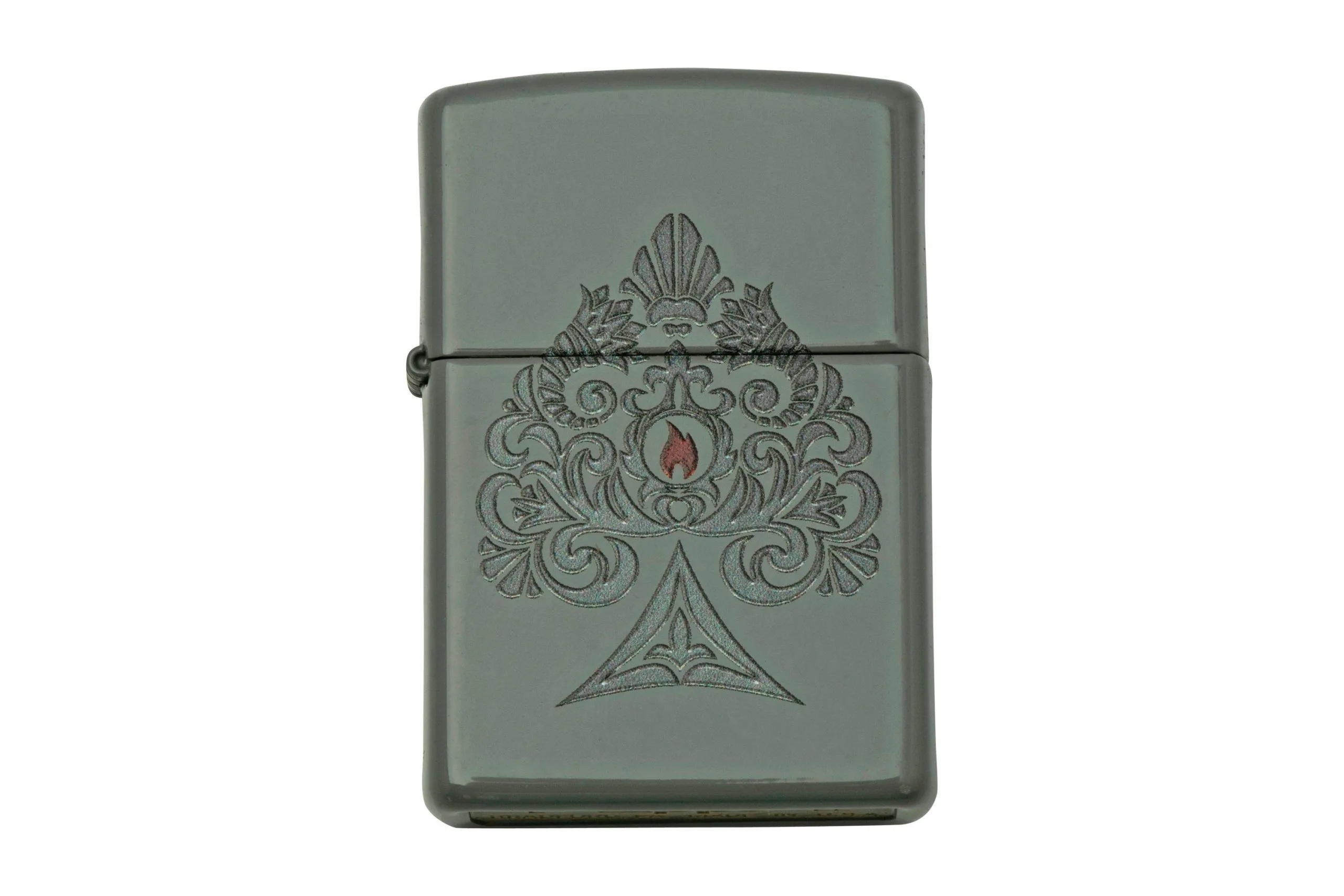 This Zippo lighter is matt black and features a complicated laser-engraved design.